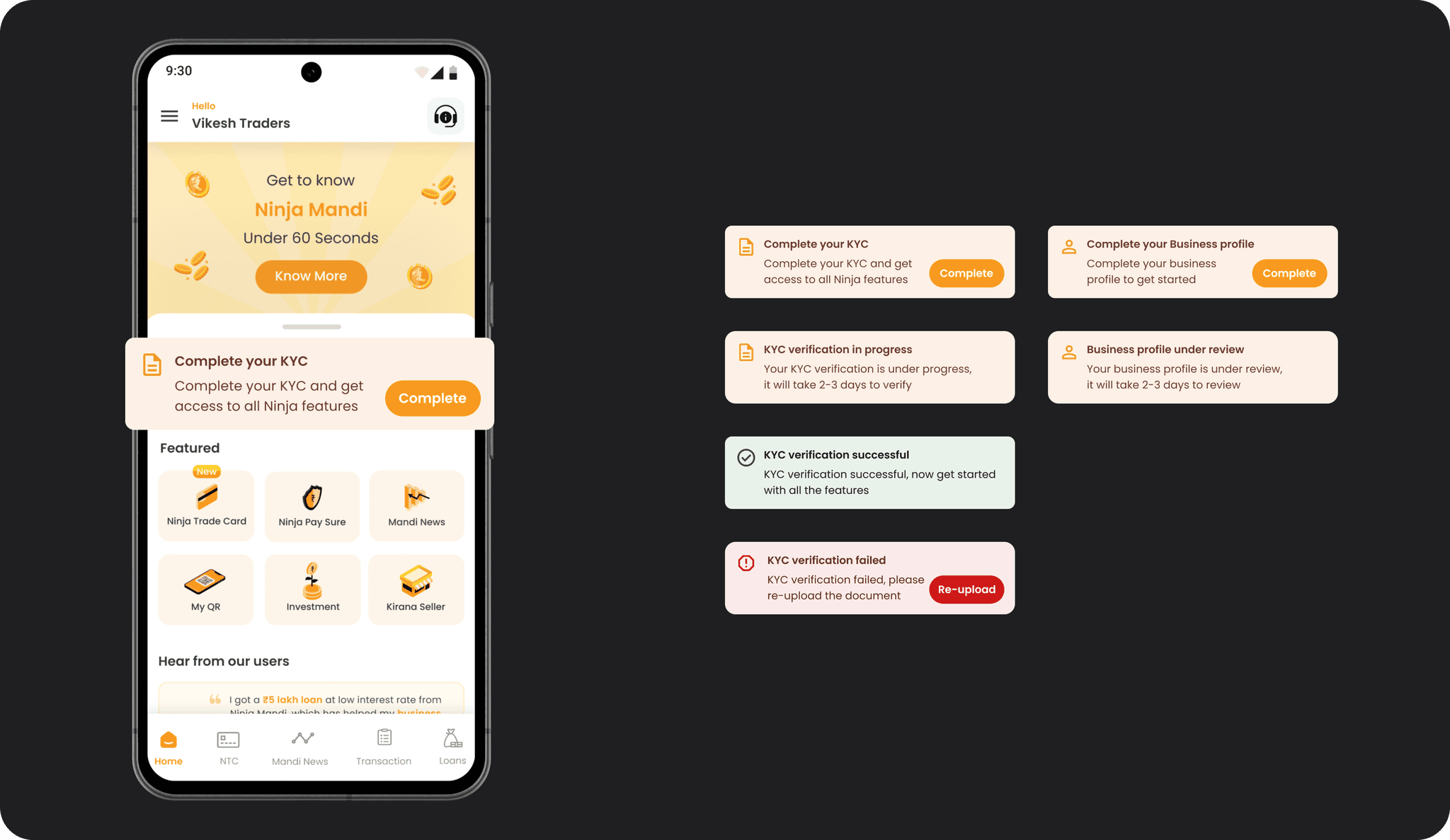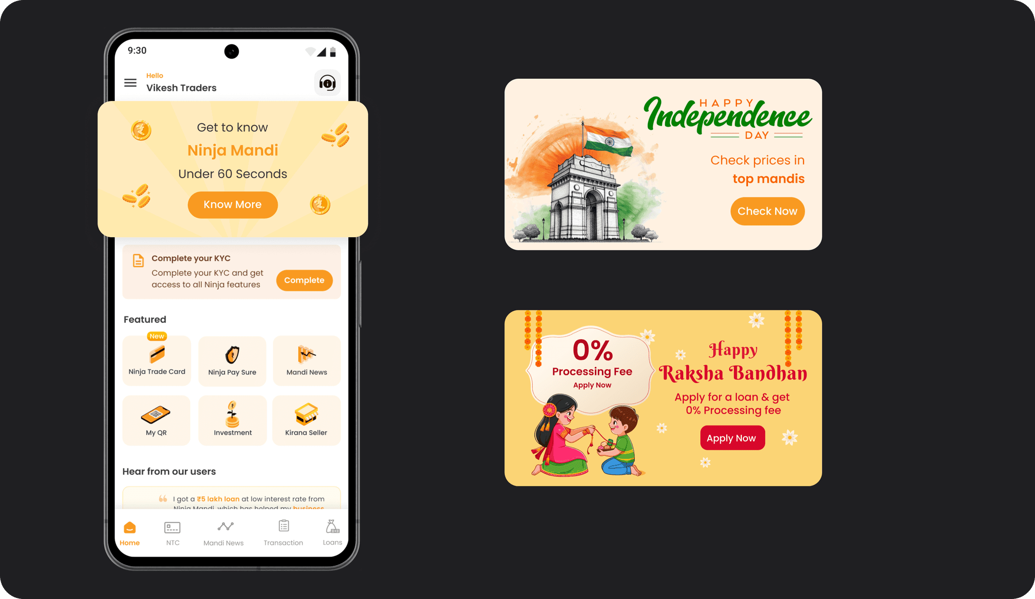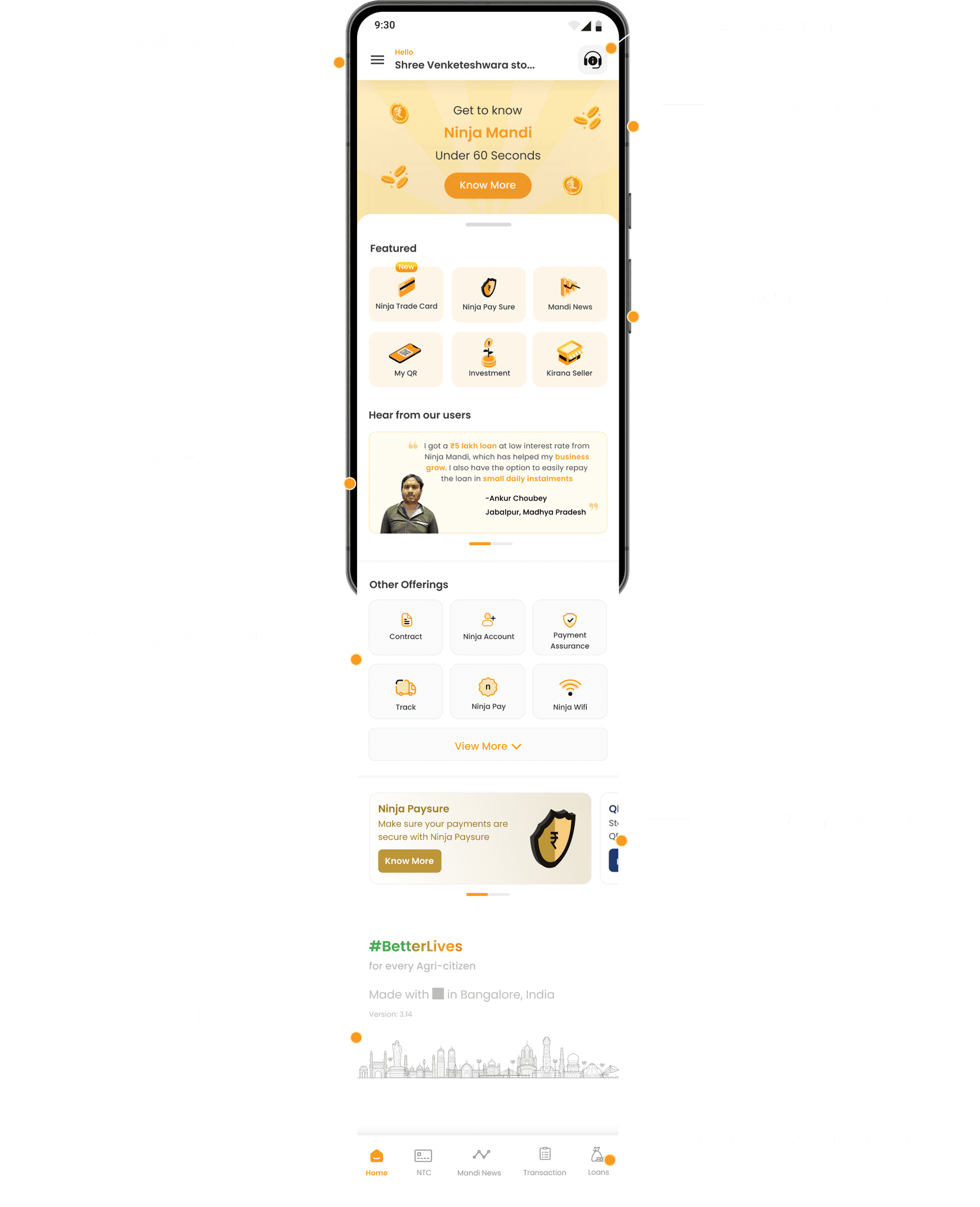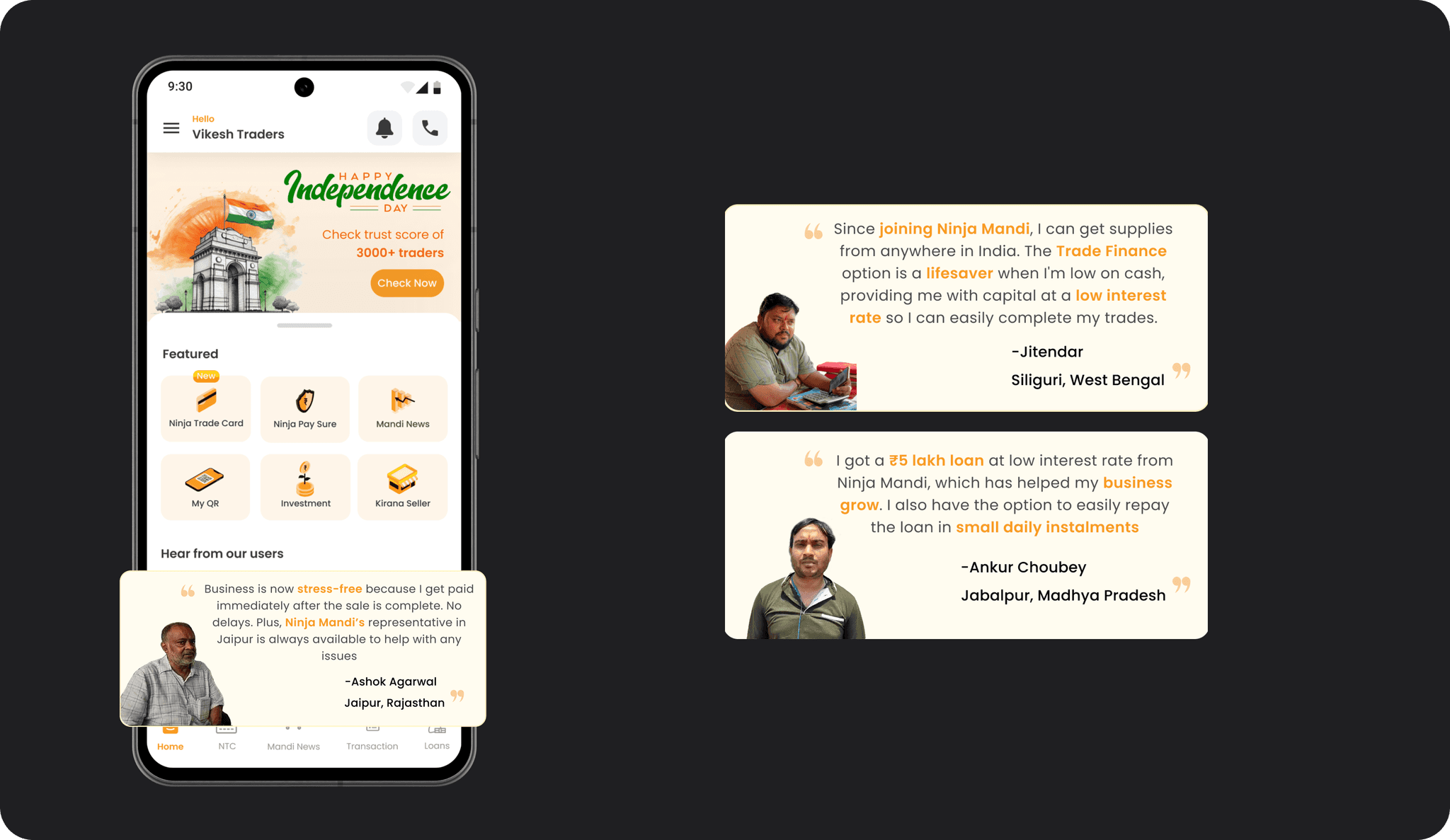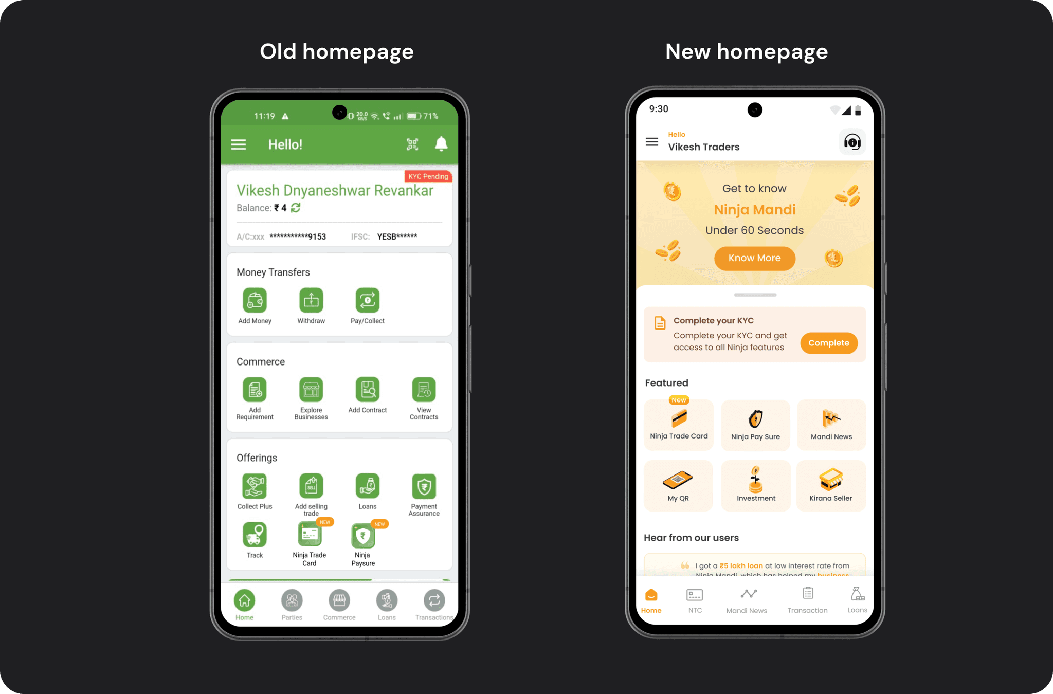 Previously absent, the testimonials section was introduced to build trust. During user research across cities like Bengaluru, Pune, Kolkata, and Aurangabad, it was evident that users take pride in their achievements. For example, a trader in Bengaluru proudly displayed a certificate he won in a competition. Reflecting this pride, the testimonial section showcases three testimonies along with pictures of top traders from various markets, based on the user’s location permissions.